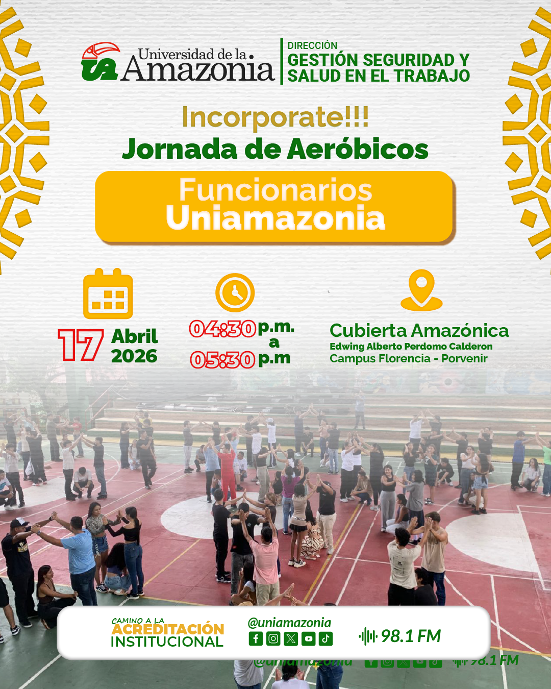 La Coordinación de Seguridad y Salud en el Trabajo te invita a participar en la jornada de aeróbicos, una iniciativa orientada a la promoción de la salud cardiovascular y al fortalecimiento de hábitos y estilos de vida saludables en nuestra comunidad laboral