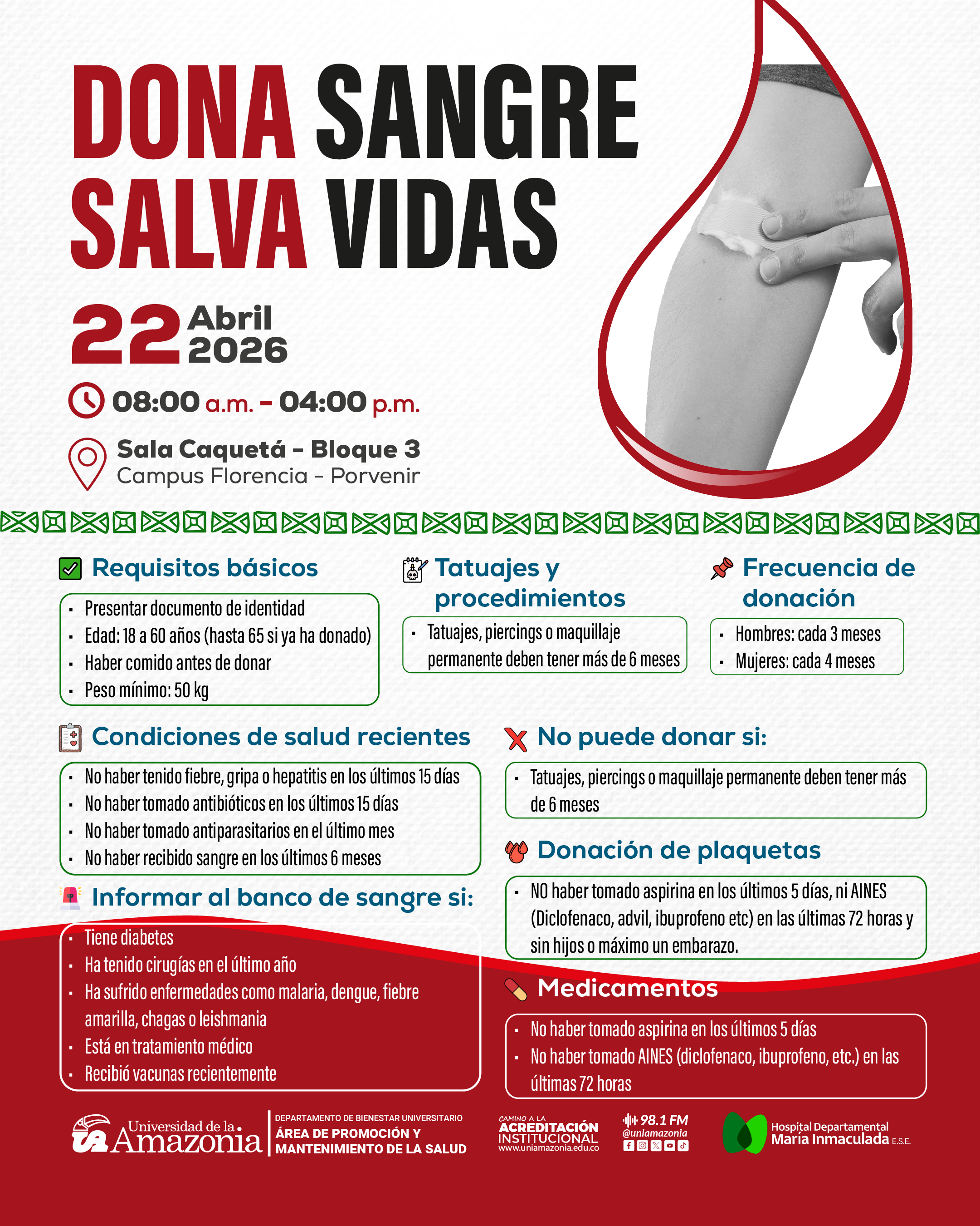 La Universidad de la Amazonia y el Área de promoción y mantenimiento de la salud hace la invitación a Estudiantes, docentes y personal administrativo, a unirnos a salvar vidas en esta gran jornada de donación de sangre que se realizará el día 22 de abril 2026, donde contaremos con la presencia del grupo de banco de sangre del Hospital María Inmaculada. Cada donación, por pequeña que sea, tiene el poder de transformar vidas y fortalecer el tejido social que nos une, teniendo en cuenta la recomendación específica para poder donar.