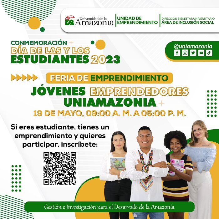 La Unidad de Emprendimiento en articulación con el área de inclusión social se permite invitar a las y los estudiantes de la Universidad de la Amazonia a participar de la "Feria de Emprendimiento Uniamazonia”, la cual se realizará el día de 19 de mayo del 2023, en la Sede Porvenir del área administrativa de 9:00 a.m. a 5:00 p.m.