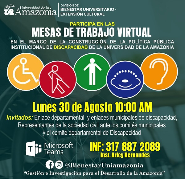 La Universidad de la Amazonia, desde la División de Bienestar Universitario y el equipo de trabajo para la Construcción de la Política Institucional de Discapacidad, invita cordialmente a los Enlaces Municipales y Departamentales de Discapacidad, además,  a los representantes de los Comités Municipales y Departamentales de Discapacidad del departamento del Caquetá, Amazonas, Putumayo, Guaviare y el Huila con el propósito de realizar el diagnóstico de las necesidades educativas de la población con discapacidad y demás procesos de accesibilidad para la debida inclusión en el ambiente universitario de esta población con enfoque diferencial, contribuyendo en la elaboración del documento maestro.