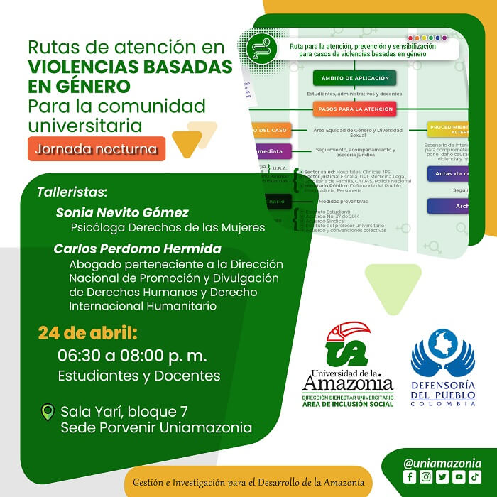 La Universidad de la Amazonia a través de la División de Bienestar Universitario hace extensiva la invitación a la comunidad universitaria a participar del taller de rutas para la Atención, prevención y sensibilización para casos de violencias basadas en género.