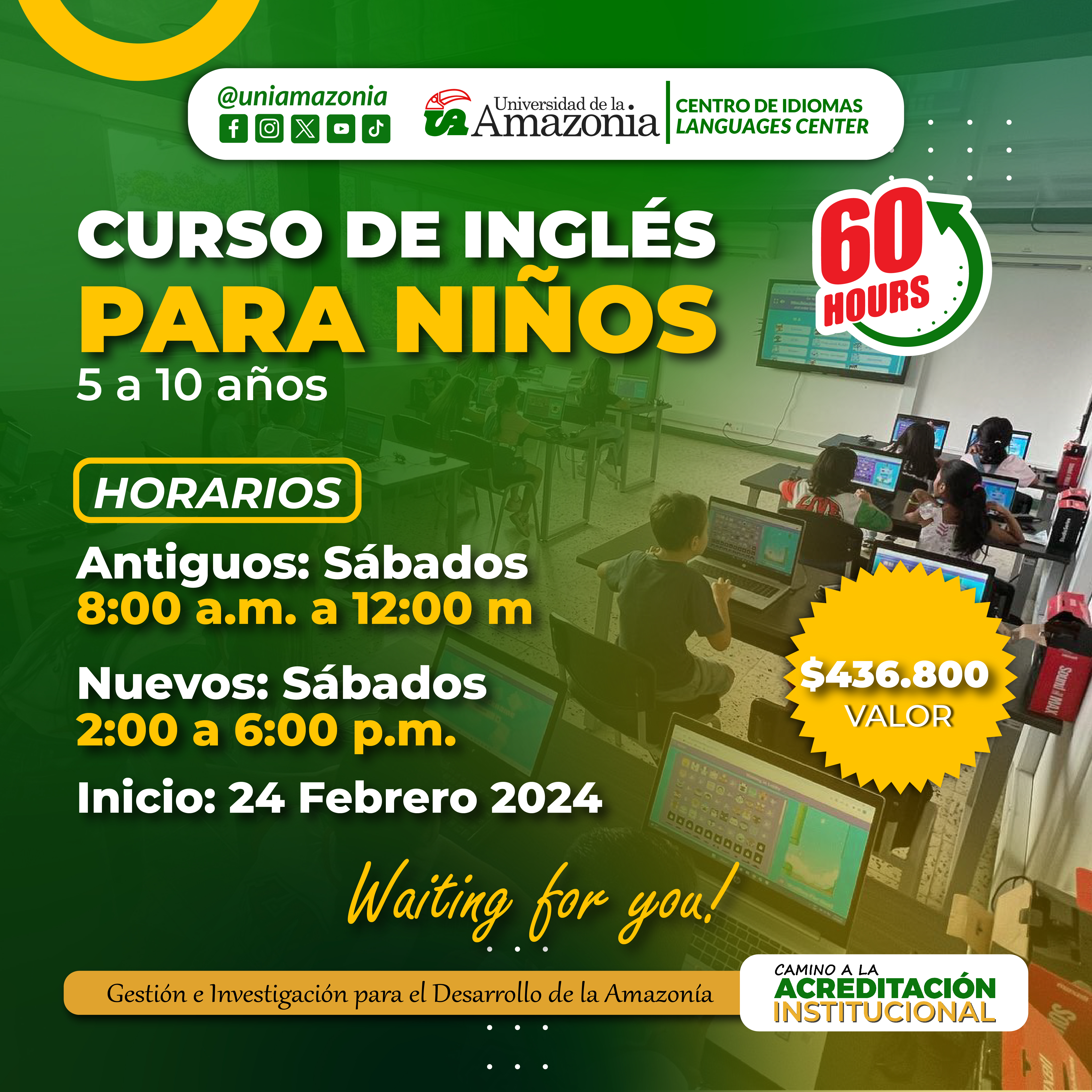 El Centro de Idiomas de la Universidad de la Amazonia informa a la comunidad universitaria y Caqueteña la apertura de las inscripciones a los Cursos de Inglés para niños, niñas y jóvenes.