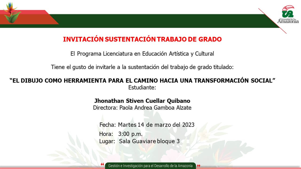 El programa Licenciatura en Educación Artística y Cultural tiene el gusto de invitarlos a participar de la sustentación de trabajo de grado titulado: EL DIBUJO COMO HERRAMIENTA PARA EL CAMINO HACIA UNA TRANSFORMACIÓN SOCIAL.