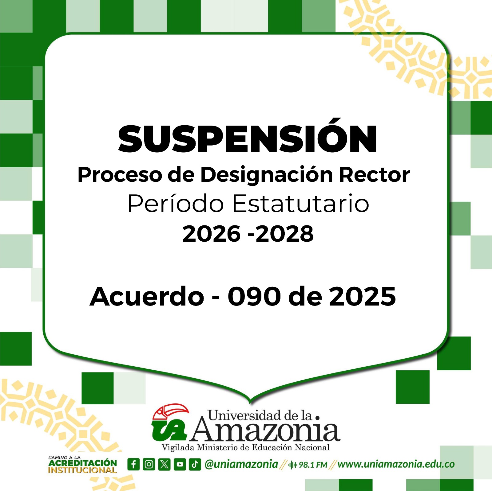 El Consejo Superior Universitario, el día 13 de noviembre de 2025, aprobó el Acuerdo 090 de 2025, Por medio del cual se suspende el proceso de designación de Rector de la Universidad de la Amazonia para el periodo estatutario 2026 - 2028.