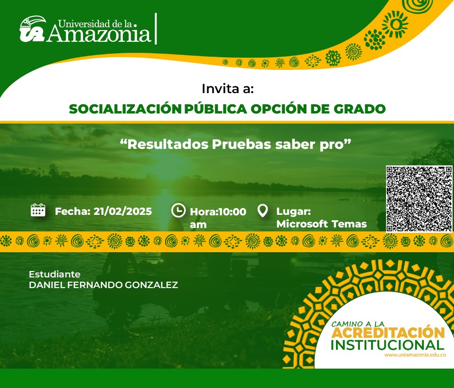 La Universidad de la Amazonia, a través del programa académico Medicina Veterinaria y Zootecnia, tiene el agrado de invitar a la comunidad universitaria y al público en general a la Socialización de resultados de pruebas saber pro como opción de grado.