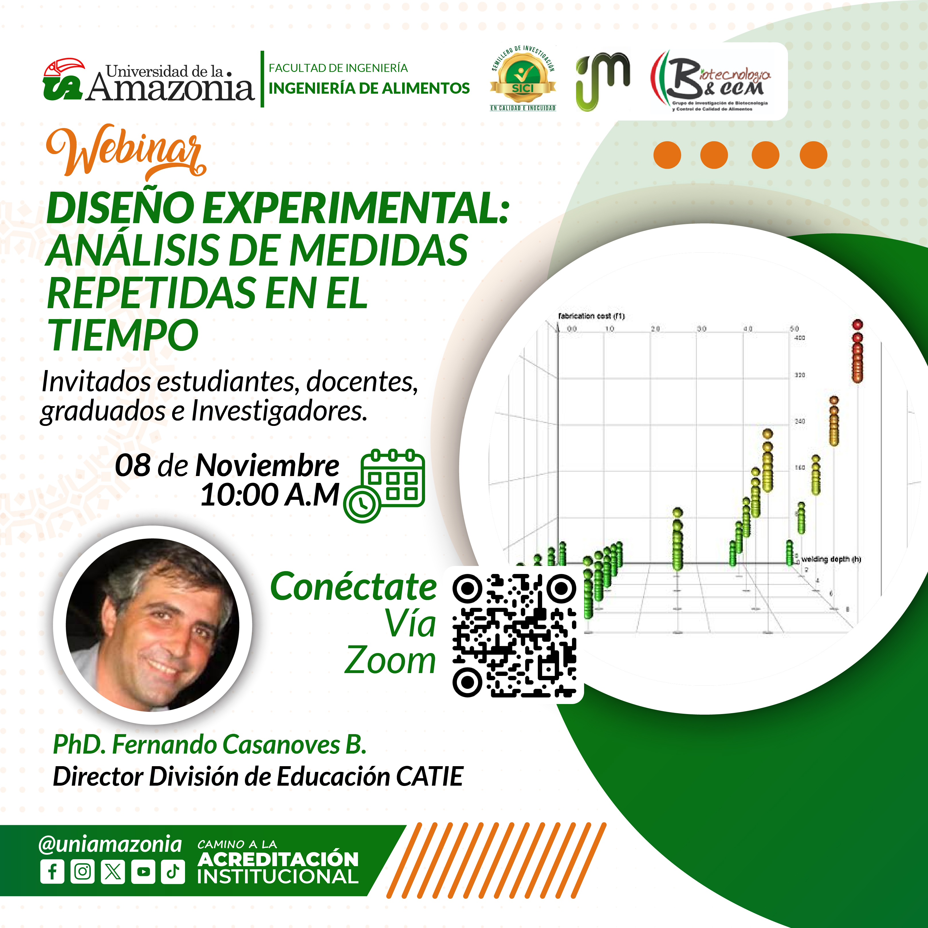 La Facultad de Ingeniería, el programa de Ingeniería de Alimentos y el grupo de investigación en Biotecnología y Control de Calidad de Alimentos tienen el gusto de invitarlos a participar del Webinar Diseño Experimental: Medidas repetidas en el tiempo, orientado por el PhD. Fernando Casanoves.