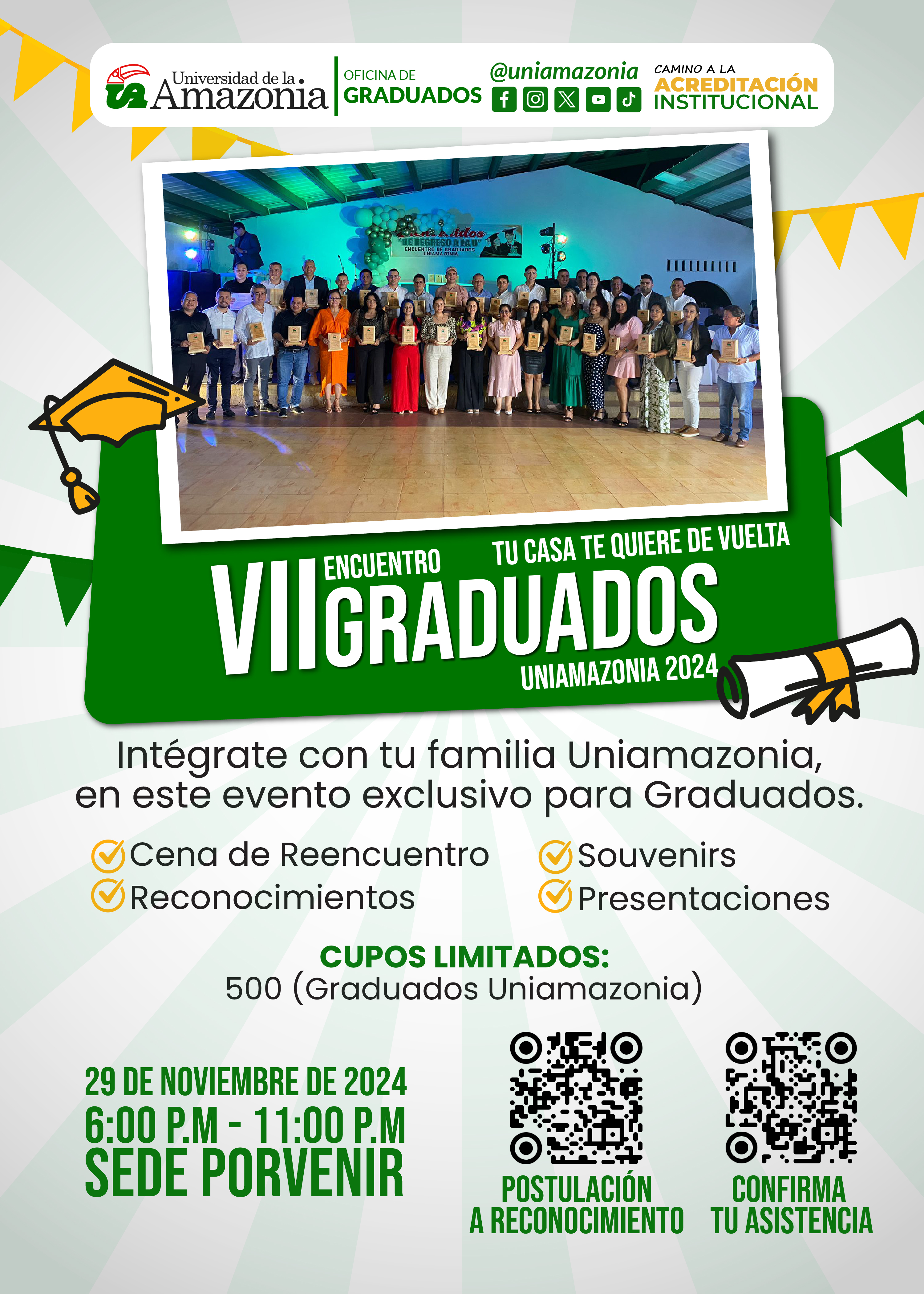 La Oficina de Graduados te invita a la Gala de Reconocimiento Anual, un evento especial donde celebraremos el VII Encuentro de Graduados Uniamazonia 2024.