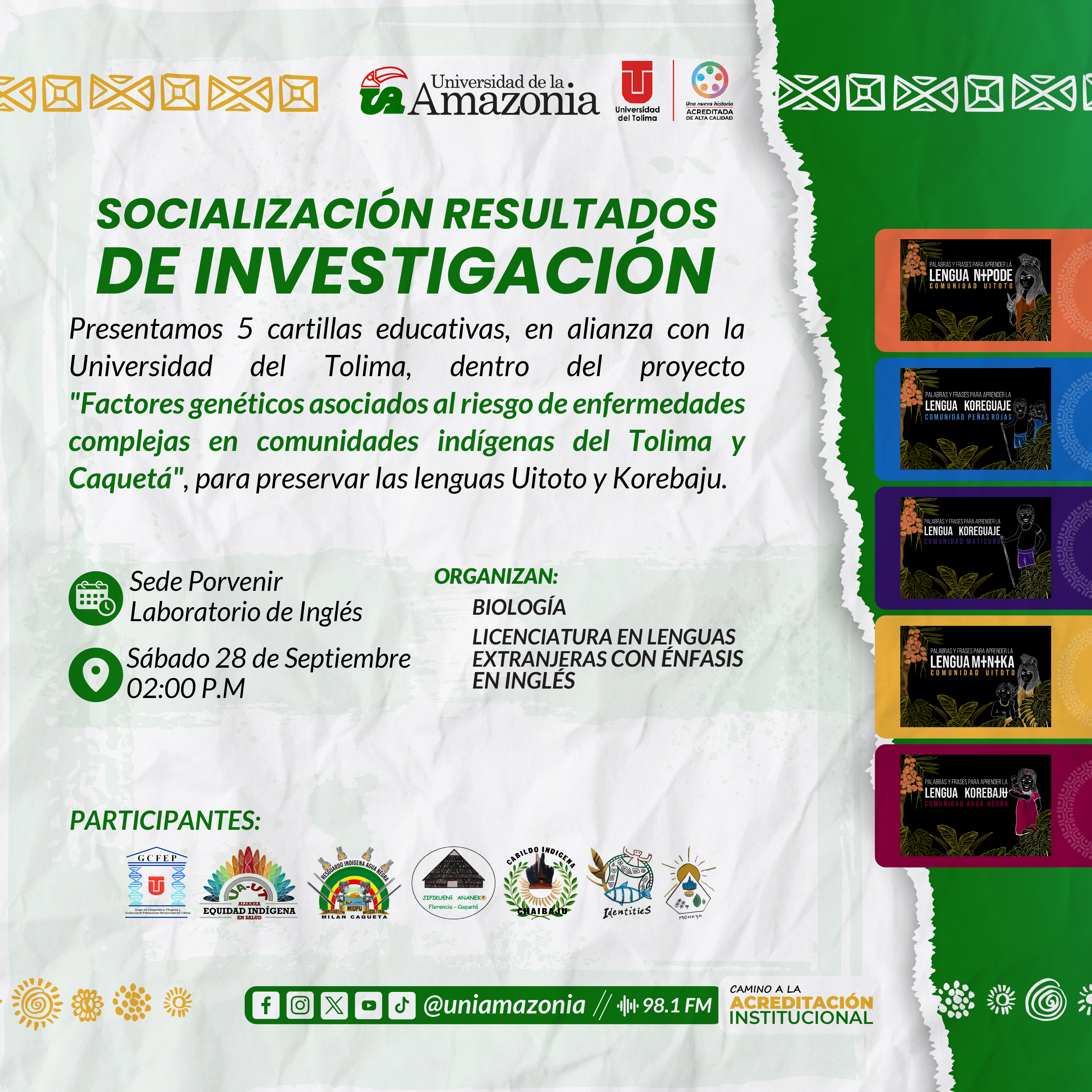 La Universidad de la Amazonia, en alianza con la Universidad del Tolima, invita a la socialización de 5 cartillas de enseñanza inicial, creadas en conjunto con comunidades indígenas, como parte del proyecto "Factores genéticos asociados al riesgo de enfermedades complejas en comunidades indígenas del Tolima y Caquetá". Estas cartillas buscan contribuir a la preservación de las lenguas nativas Uitoto y Korebaju.