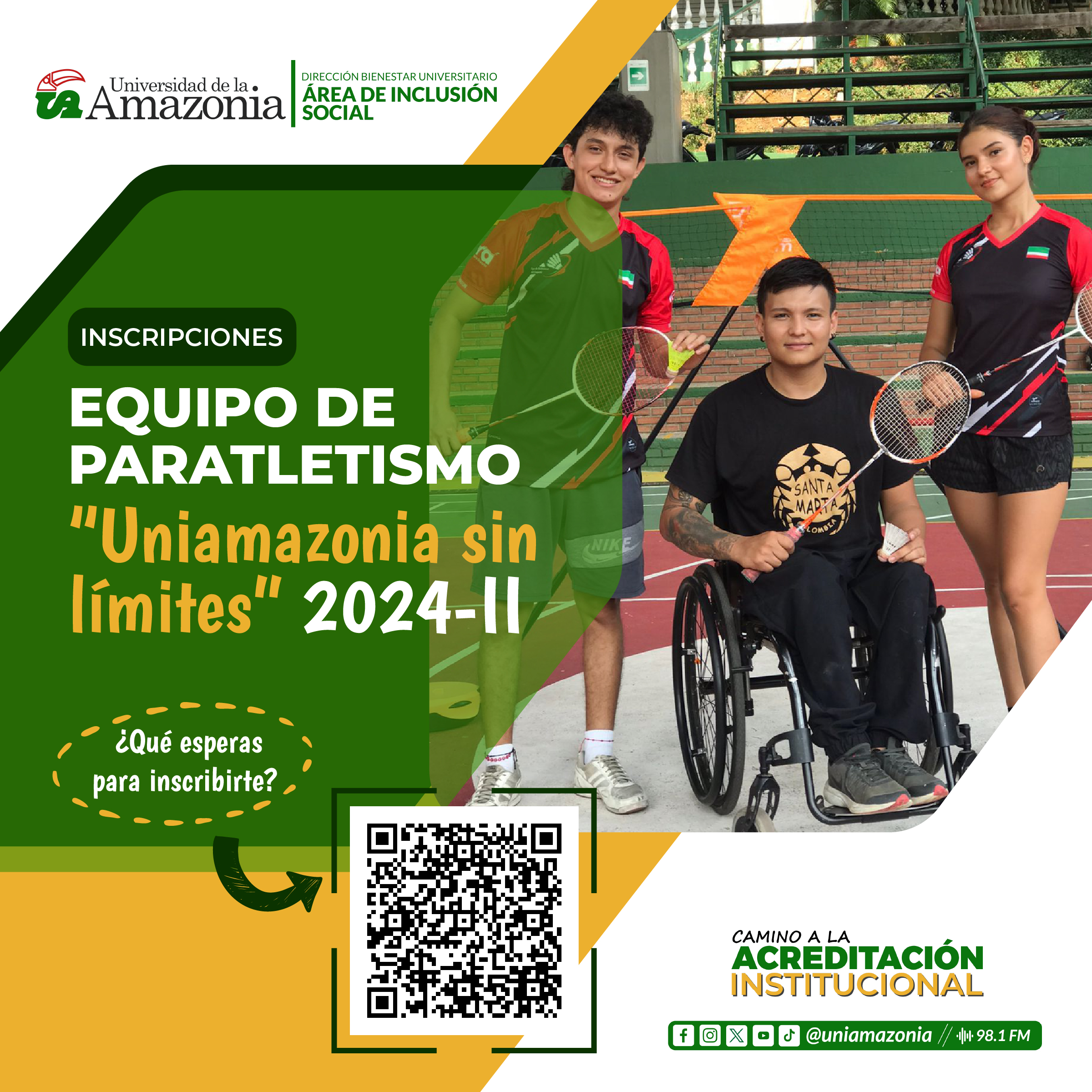 Te invitamos a ser parte del equipo de PARATLETISMO "Uniamazonia sin límites". ¡Desde Bienestar Universitario y el Área de Inclusión Social, extendemos esta invitación a toda la Comunidad Universitaria!