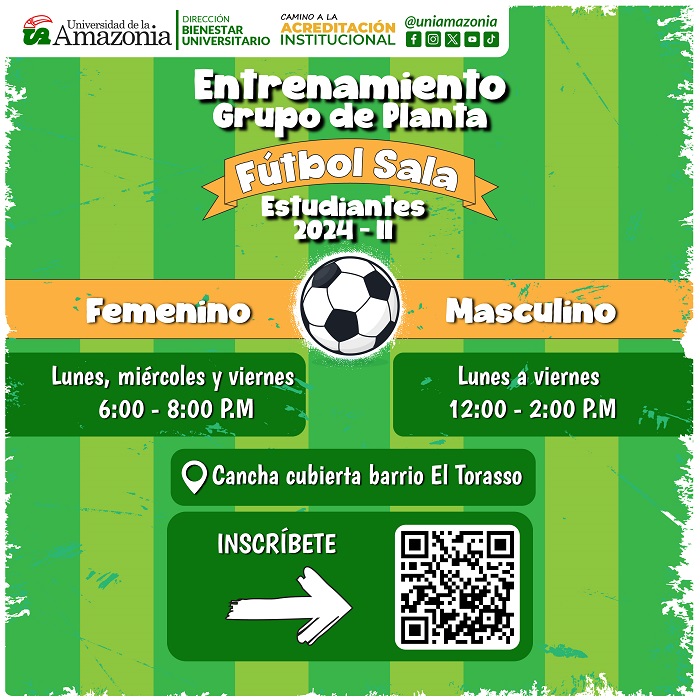 Desde la Dirección de Bienestar Universitario, invitamos a la comunidad estudiantil nueva del semestre 2024-2 de la Universidad de la Amazonia a unirse al equipo de fútbol sala.