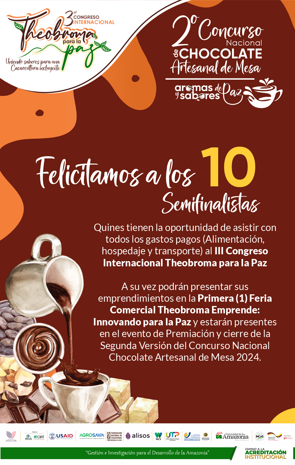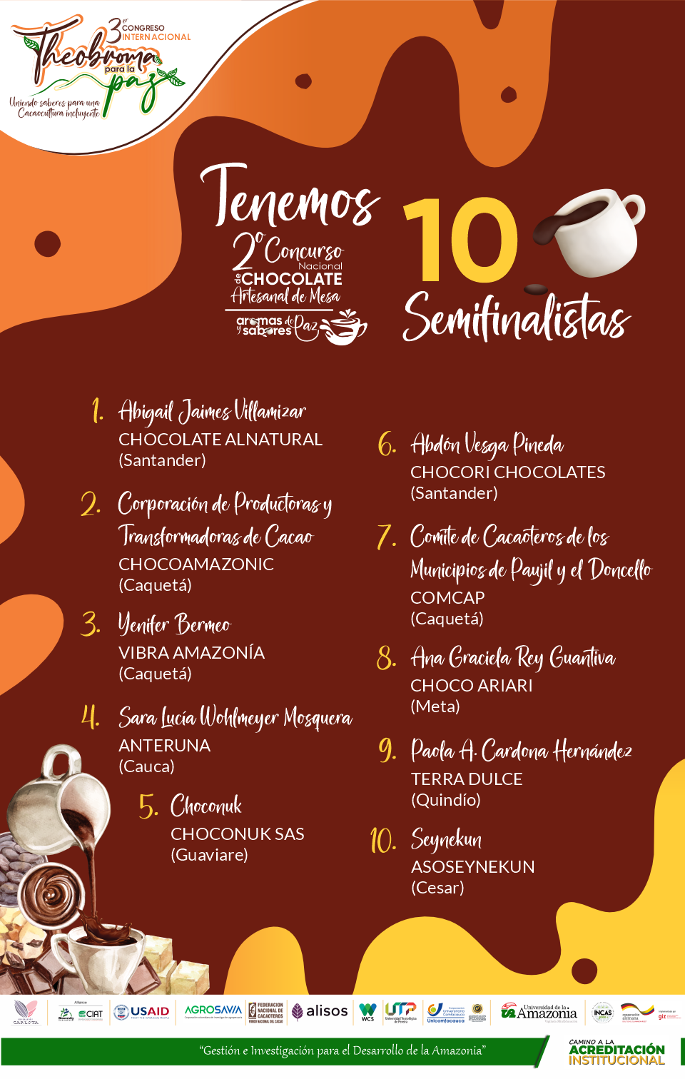 A continuación, nos complace darles a conocer la lista de los 10 Semifinalistas que pasan a la Fase 2 de la segunda versión del Concurso Nacional de Chocolate Artesanal de Mesa "Aromas y sabores de paz" en el marco del Tercer Congreso Internacional Theobroma para la Paz