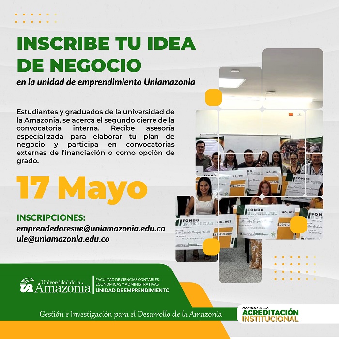 !Llega el segundo cierre de Convocatoria Interna!. Desde la Unidad de Emprendimiento de la Universidad de la Amazonia, invitamos a Estudiantes y Graduados de la Universidad a inscribir sus ideas de negocios. "Postula tu Emprendimiento"