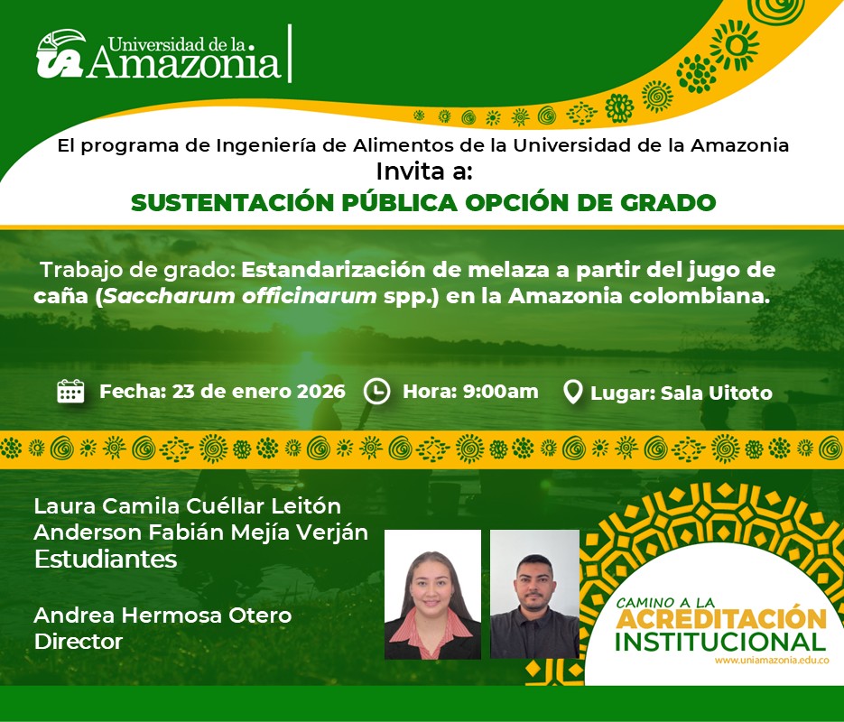 La Universidad de la Amazonia, a través del Programa de Ingeniería de Alimentos, tiene el gusto de invitar a la comunidad universitaria y al público en general a la socialización pública de la opción de grado: