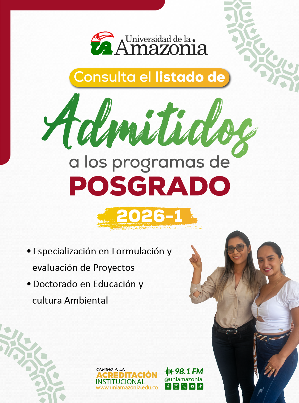 De conformidad con el Calendario Académico para el desarrollo de las actividades correspondientes al primer periodo académico 2026 - l en los Programas de Posgrado, se publica el listado de admitidos a la Universidad de la Amazonia para los programas: