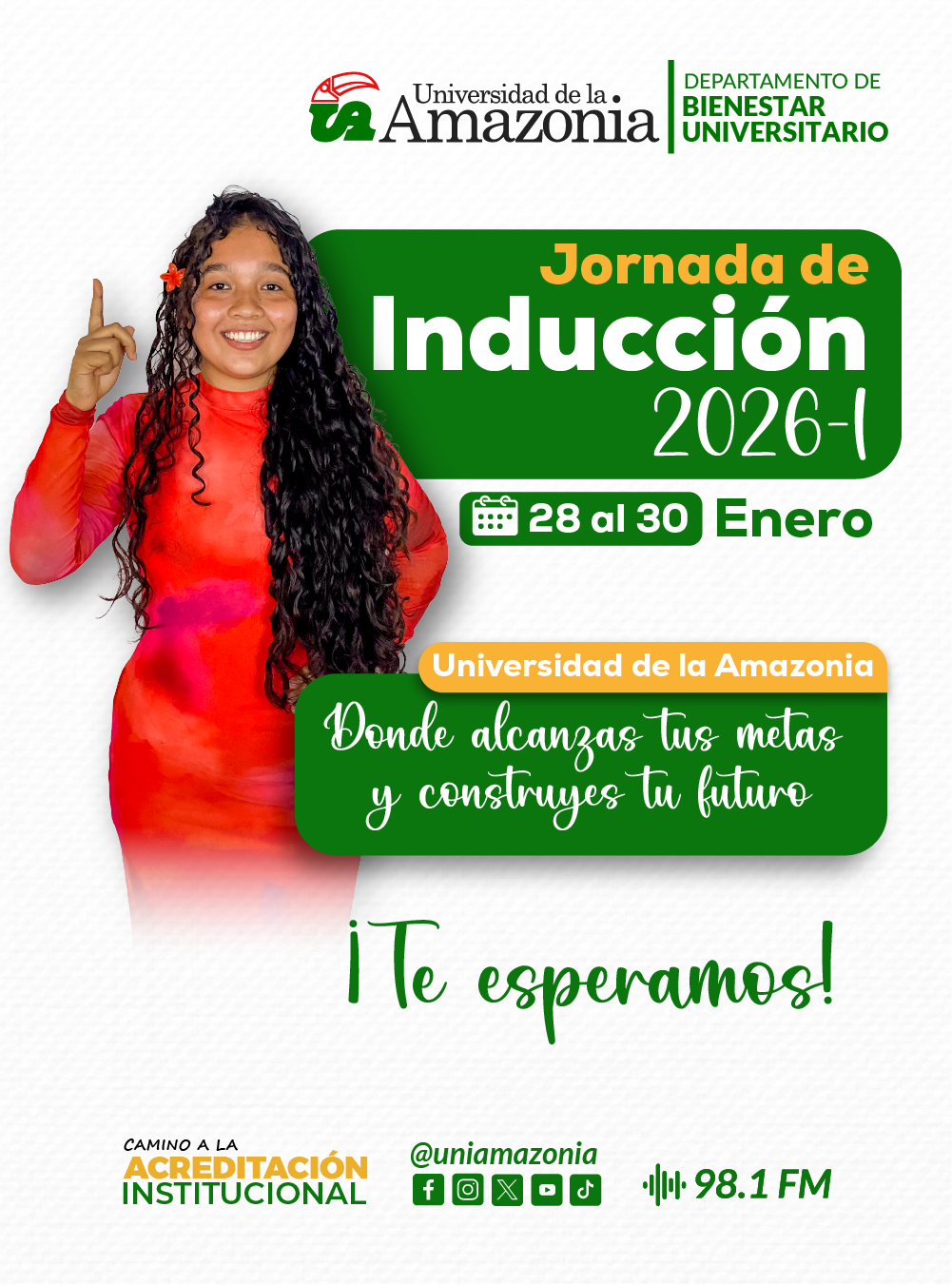 La Universidad de la Amazonia te invita a vivir una experiencia única e inolvidable en la Jornada de Inducción 2026-I, del 28 al 30 de enero . Este evento no es solo una bienvenida: es el primer paso hacia una etapa de crecimiento, retos y logros que transformarán tu vida.