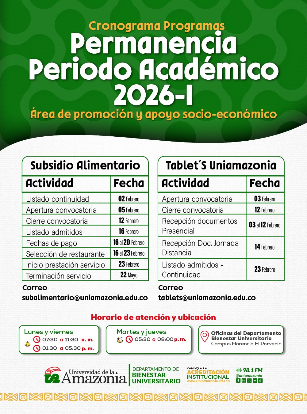 La Universidad de la Amazonia, a través del Departamento de Bienestar Universitario y el Área de Promoción y Apoyo Socioeconómico, informa a la comunidad académica las fechas importantes de los Programas Subsidio Alimentario y Tablet´s Uniamazonia, correspondientes al período académico 2026-I