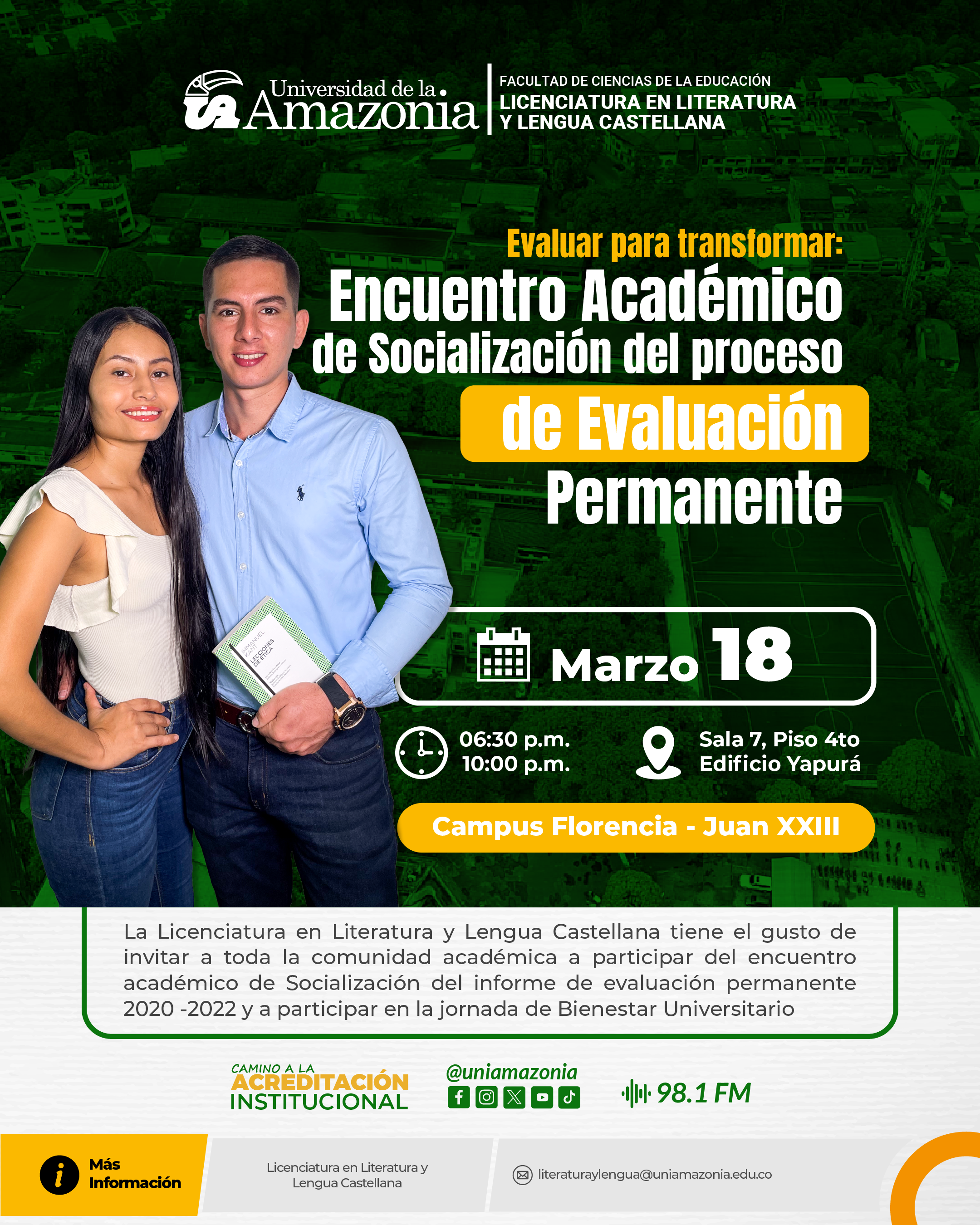 La Licenciatura en Literatura y Lengua Castellana invita cordialmente a estudiantes, profesores, egresados, administrativos y comunidad en general a participar en el evento Evaluar para transformar: Encuentro académico de socialización del proceso de evaluación permanente. Este espacio será una oportunidad para conocer los avances, reflexionar sobre los retos y construir colectivamente estrategias de mejoramiento, en el marco del compromiso institucional con la calidad académica y el proceso de acreditación de alta calidad.