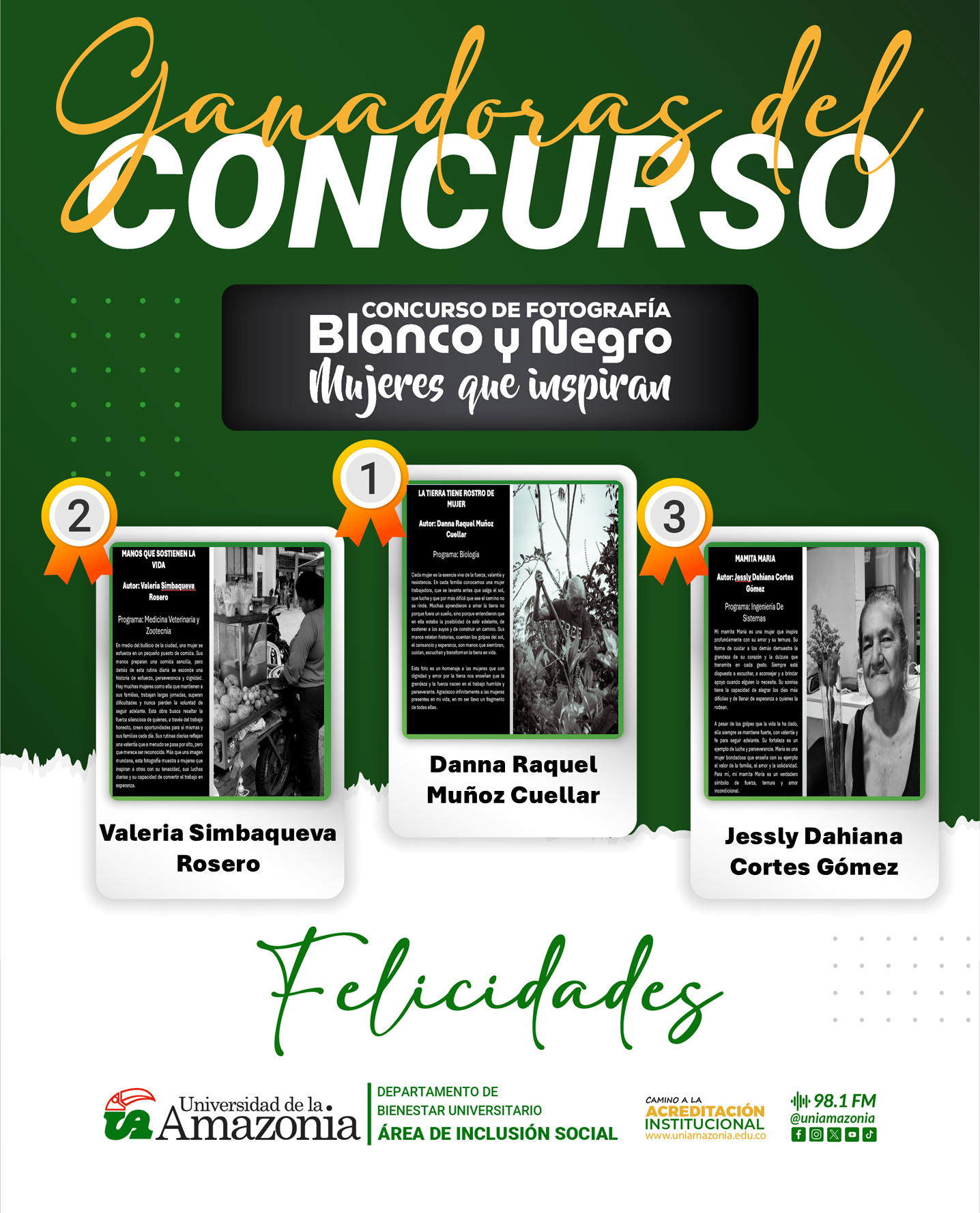 El Área de Inclusión Social del Departamento de Bienestar Universitario de la Universidad de la Amazonia, anuncia las fotografías ganadoras del concurso de fotografía blanco y negro “Mujeres que inspiran”, realizado en el marco de la conmemoración del Día Internacional de la Mujer 2026.
