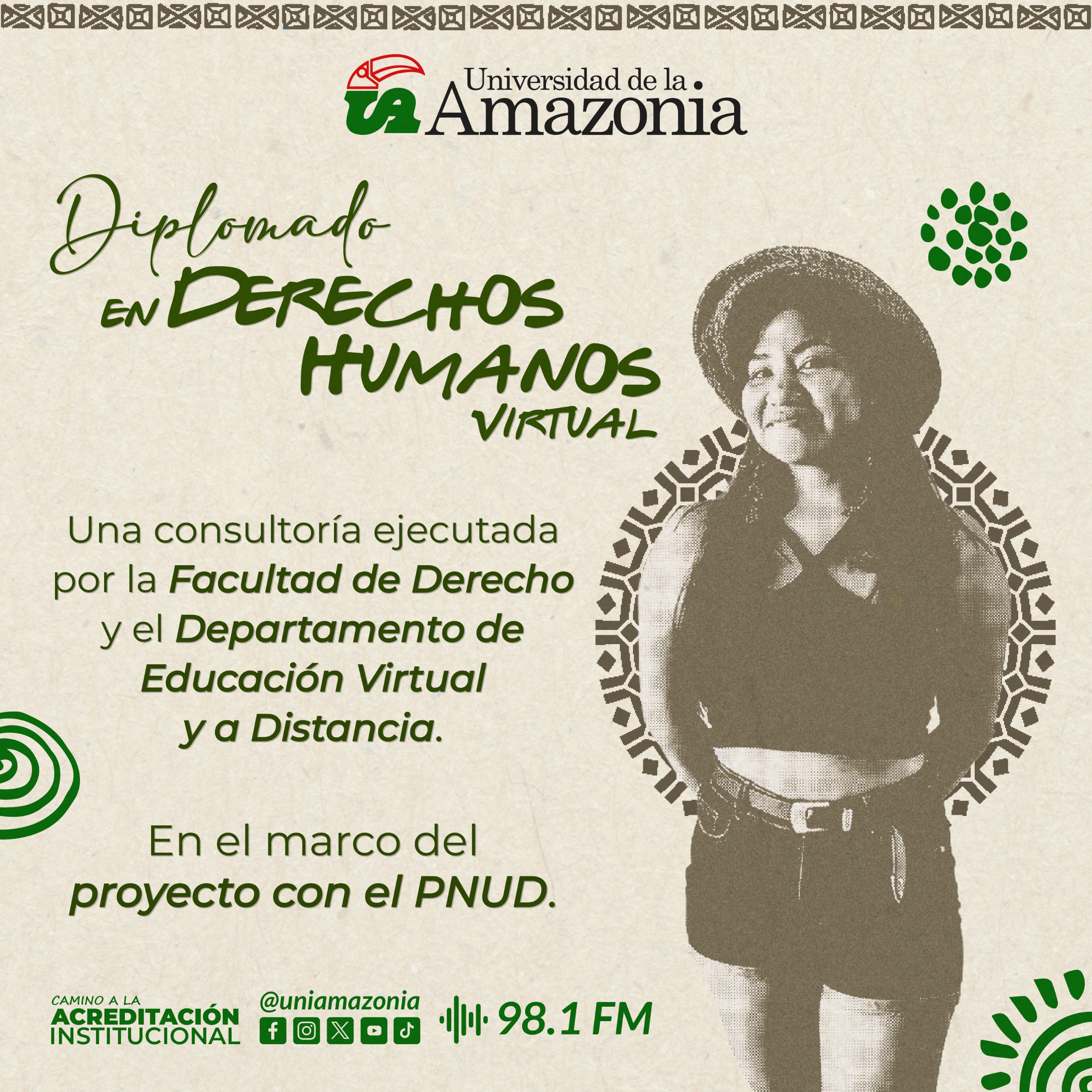 La Universidad de la Amazonia celebra que, a través de la Facultad de Derecho y con el apoyo del Departamento de Educación Virtual y a Distancia, ejecutará una consultoría del PNUD en el marco del proyecto “Fortalecimiento de las capacidades del Ministerio del Interior: Implementación del Acuerdo de Paz, seguridad humana y respeto por los DD. HH.”.