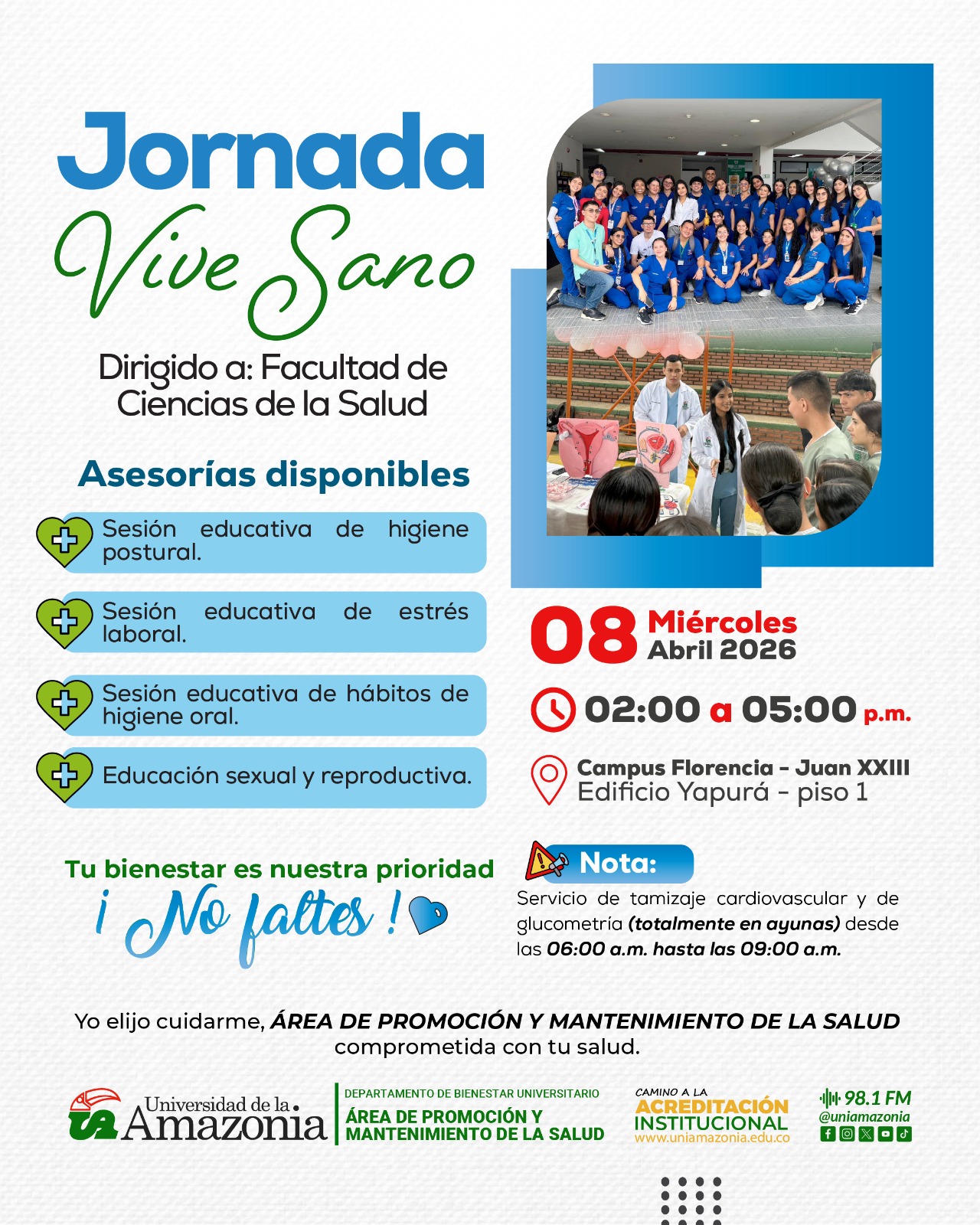 El Departamento de Bienestar Universitario, a través del área de Promoción y Mantenimiento de la Salud te invita a participar en nuestra Jornada Vive Sano dirigida a todos los estudiantes del programa académico de Enfermería y Psicología.