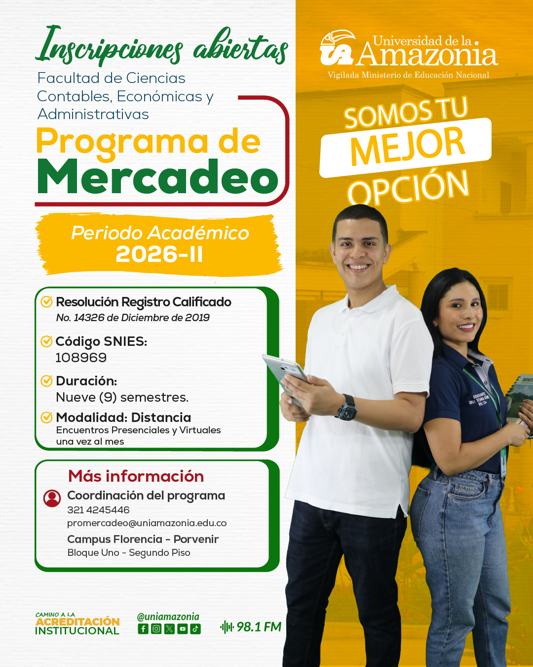 ¡La Universidad de la Amazonía, a través del Programa de Mercadeo, adscrito a la Facultad de Ciencias Contables, Económicas y Administrativasabre sus inscripciones para el periodo académico 2026-II!