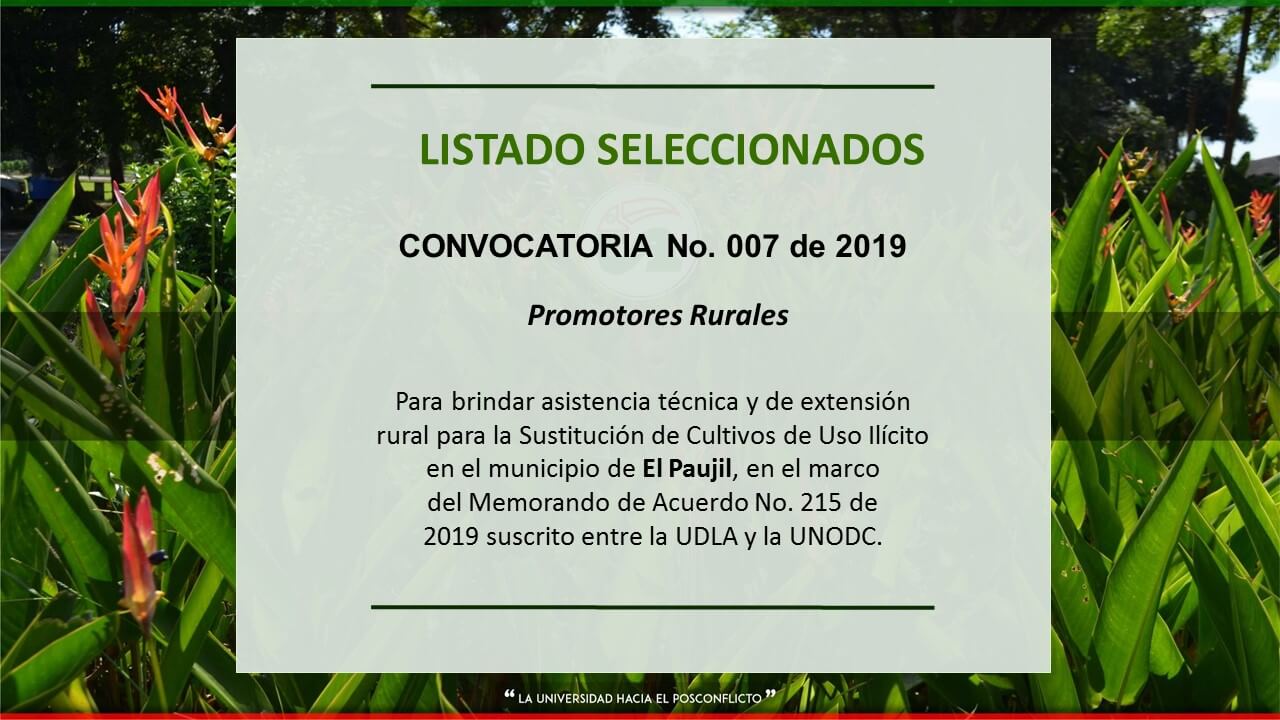 Listado de seleccionados de la Convocatoria No. 007 de 2019 - Promotores Rurales" Para brindar asistencia técnica y de extensión rural para la Sustitución de Cultivos de Uso Ilícito en el municipio de El Paujil, en el marco del Memorando de Acuerdo No. 215 de 2019 suscrito entre la UDLA y la UNODC.